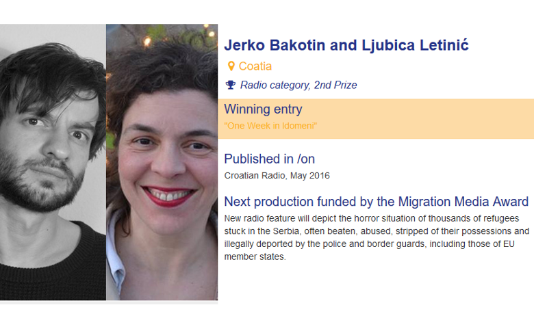 Dokumentarna emisija 'Jedan tjedan u Idomeniju' autora Jerka Bakotina osvojila je drugu nagradu na natjecanju Migration Media Award. Nagrada je to koja se dodjeljuje autorima 36 novinarskih radova na temu migracija u europsko-mediteranskome području prema kriteriju izvrsnosti, relevantnosti i novinarske upečatljivosti“.